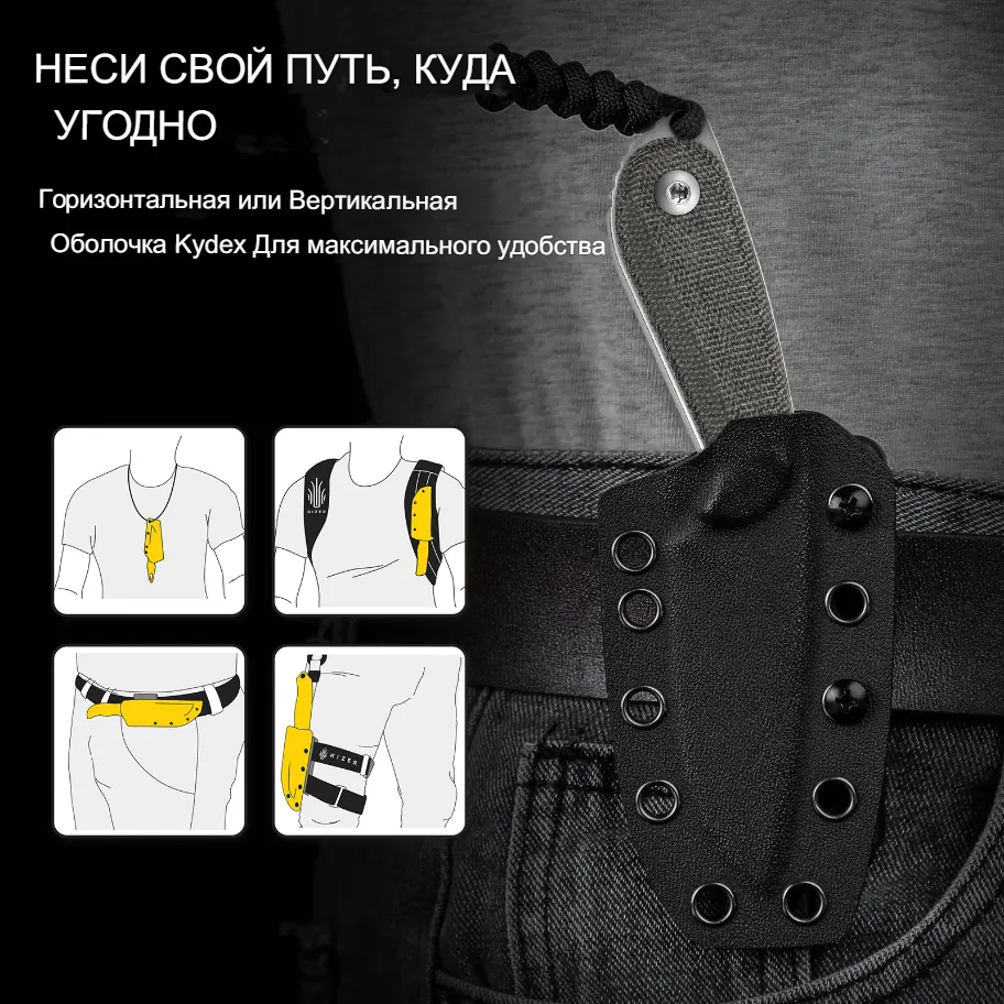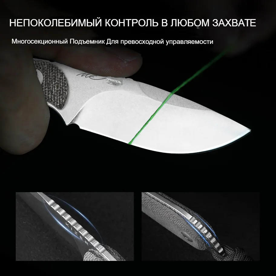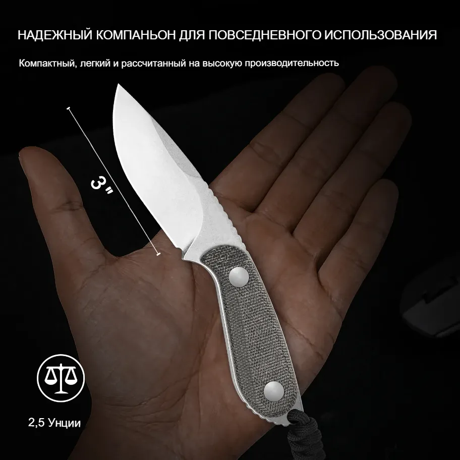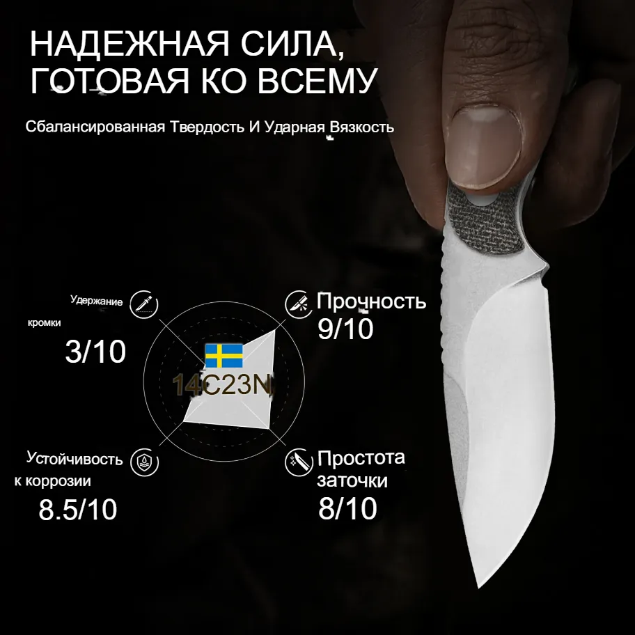 -Стильный и практичный: сочетание современного дизайна и функциональности.-Надежность и долговечность: фиксированное лезвие из прочной нержавеющей стали 14C28N с побелкой камнем.