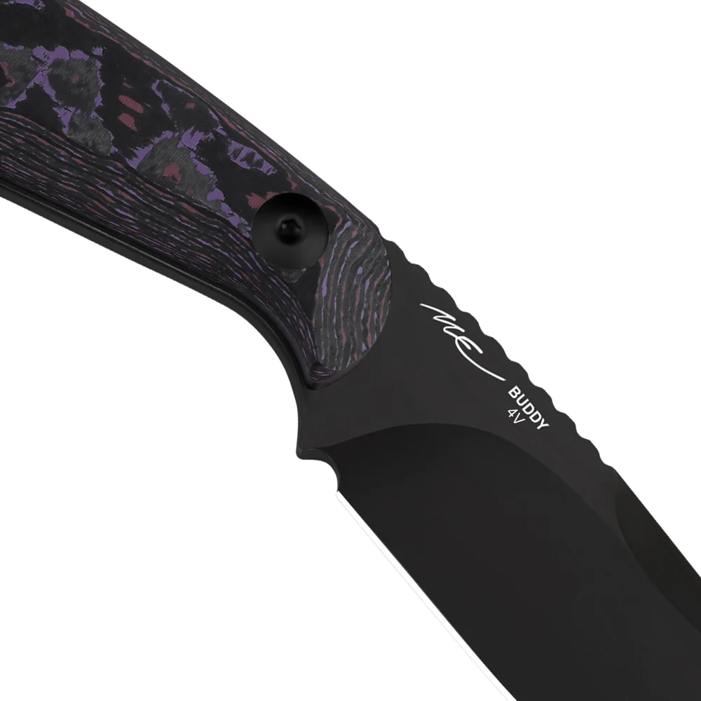 BUDDY сочетает роскошь материалов с продуманной эргономикой. Лезвие выполнено из стали 4V с полированным DLC‑покрытием, что обеспечивает исключительную прочность кромки и стойкость к износу. Геометрия лезвия Drop Point делает нож универсальным помощником — для повседневных задач, походов и активного отдыха. Рукоять из Fat Carbon Purple Haze подарит не только надежный хват, но и уникальный эстетический акцент: многоступенчатая фактура и фиолетовый оттенок создают эффектный внешний вид. Облик ножа дополняется премиальным дизайном и вниманием к деталям, превращая его в стильный аксессуар помимо функциональности.Преимущества