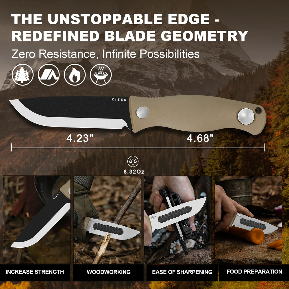 -Эффективная резка в холодной среде: продуманная геометрия снижает сопротивление и позволяет резать плавно, почти без усилий.-Долотообразная заточка: глубоко проникает в твёрдые материалы — замороженное мясо и твёрдая древесина становятся под силу даже в полевых условиях.