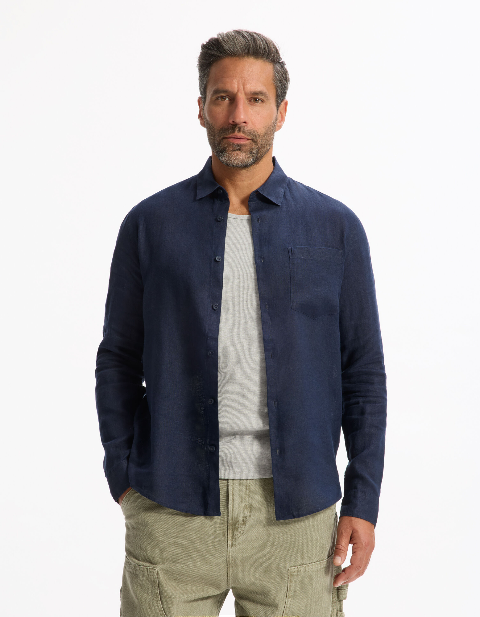Рубашка с длинными рукавами — классика в современном исполнении. Обычный прямой крой, аккуратный французский воротник и накладной карман создают универсальный, легко сочетаемый образ. Изготовлена из 100% натурального льна — дышащего и терморегулирующего материала, который сохраняет прохладу в жару и выглядит стильно в любой ситуации.