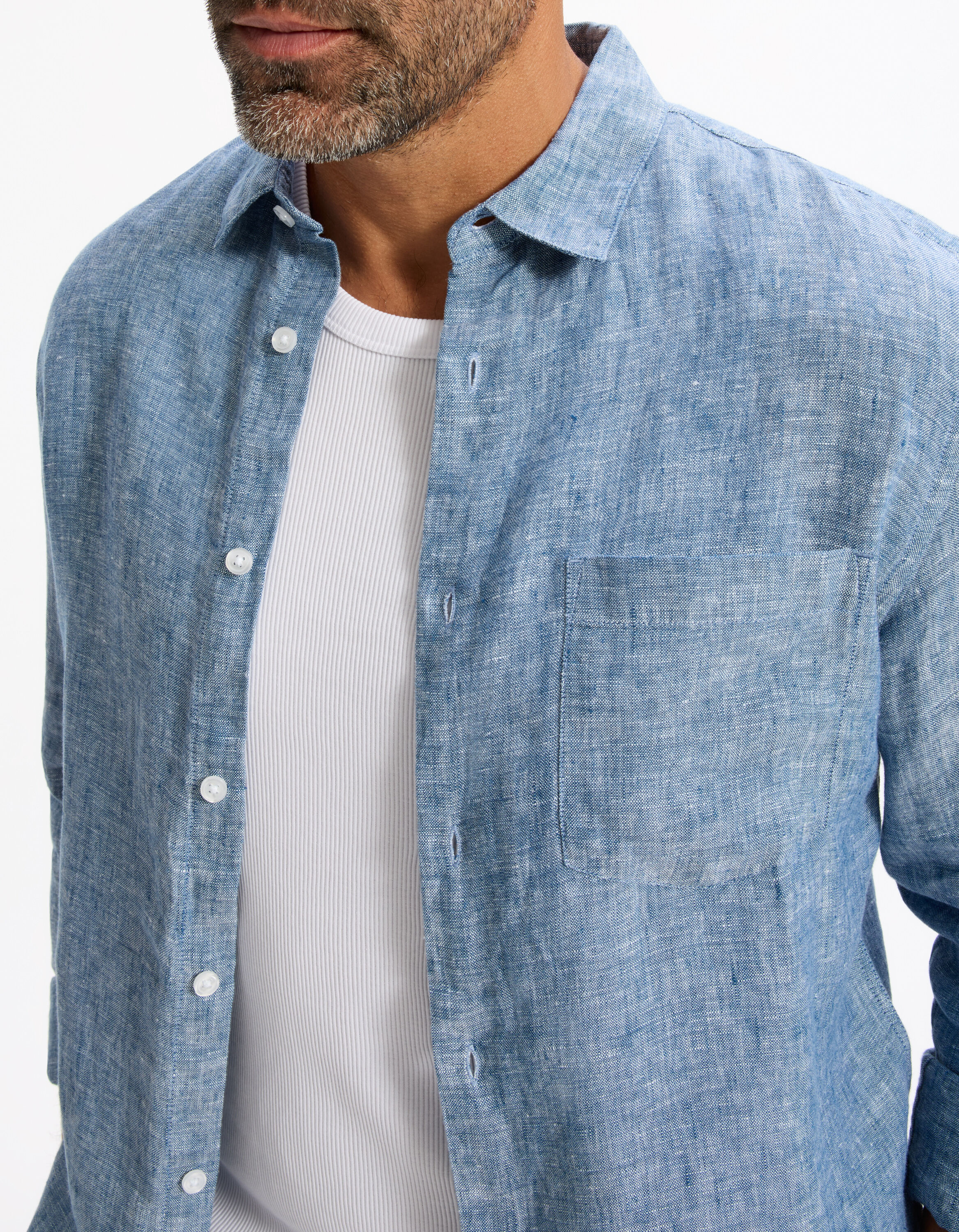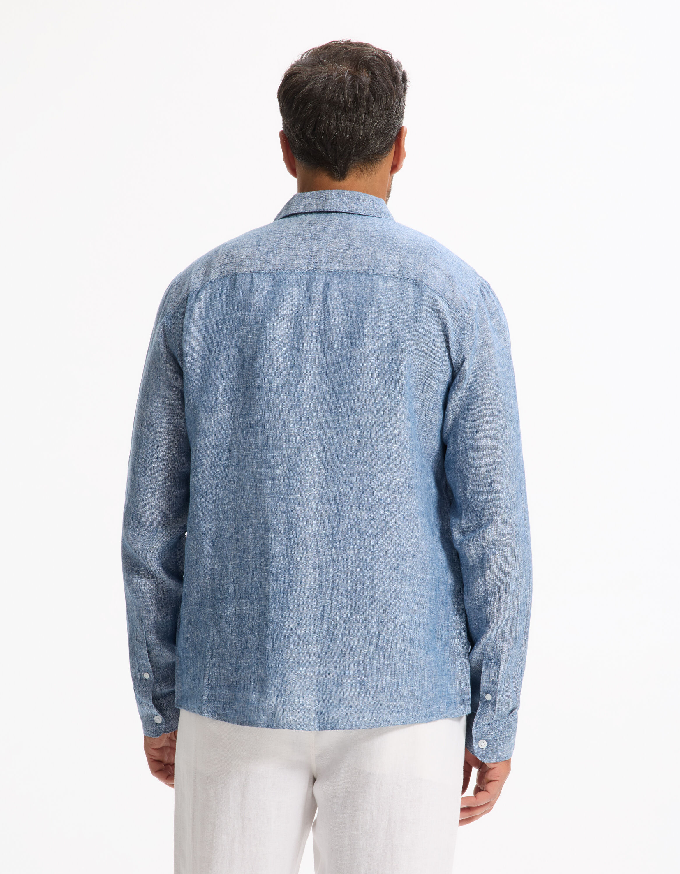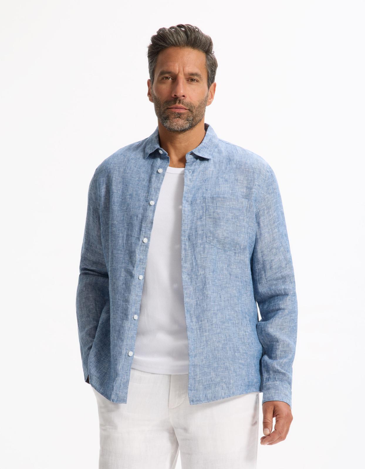 Однотонная синяя рубашка из шамбре в классическом (обычном) крое — идеальный баланс стиля и комфорта. Выполнена из 100% льна, с французским воротником, длинными рукавами и накладным карманом. Продуманная модель для жаркого сезона: натуральный лен обеспечивает терморегуляцию и дарит ощущение прохлады в течение всего лета.